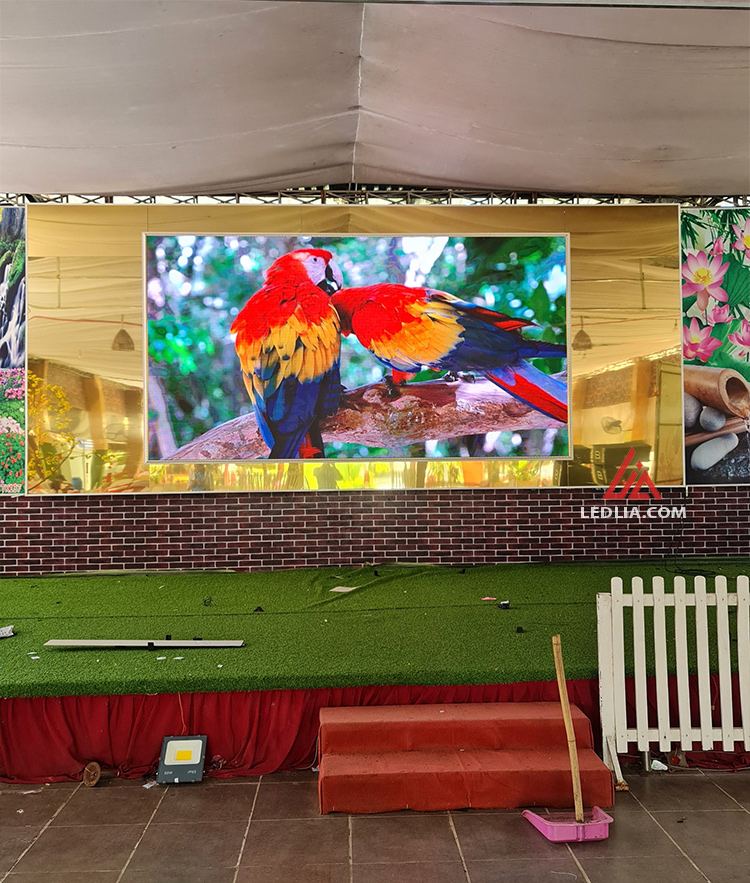 Màn hình LED P3 trong nhà được chúng tôi cung cấp đến Khách Hàng với kích thước hiển thị rộng 4m032 và cao 2m304. Với mong muốn làm nổi bật sân khấu và màn hình LED, LEDLIA chúng tôi đã tư vấn Khách Hàng ngoài màn hình LED ra thì có thêm viền trang trí nẹp gỗ và ốp toàn bộ alulumin gương vàng.